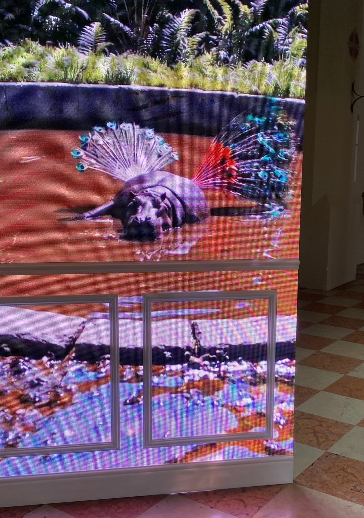 Gezeigt werden auch Videos, in denen Tiere sich anders darstellen: ein Flusspferd mit Pfauenfedern auf dem Rücken, ein Dachs mit dem Körper einer Schildkröte, Fische mit Geweihen. Eine verrückte Welt, generiert durch KI – abhängig von den Vorgaben des Künstlers. Teils lustig, teils verstörend. Die Frage stellt sich: Wer ist der Schöpfer – der Künstler oder die KI? Klar ist: Der Künstler gibt der KI die Anweisungen.
