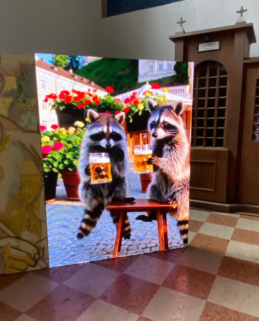 In einer Seitenkapelle spielt sich stündlich eine Art Miniaturwunder ab: Auf den Screens erscheint eine Gruppe von Waschbären – ein Markenzeichen des Künstlers – umgeben von digitalen Kerzen. Sie singen Daphne Ahlers’ beruhigende Version von As Long As You Love Me. Danach verschwinden sie, und nur die flackernden Kerzen bleiben zurück. Es ist komisch. Es ist berührend. Es ist ein wenig albern. Und doch bleibt etwas hängen – eine Art Aufrichtigkeit, die sich nicht auflösen lässt.