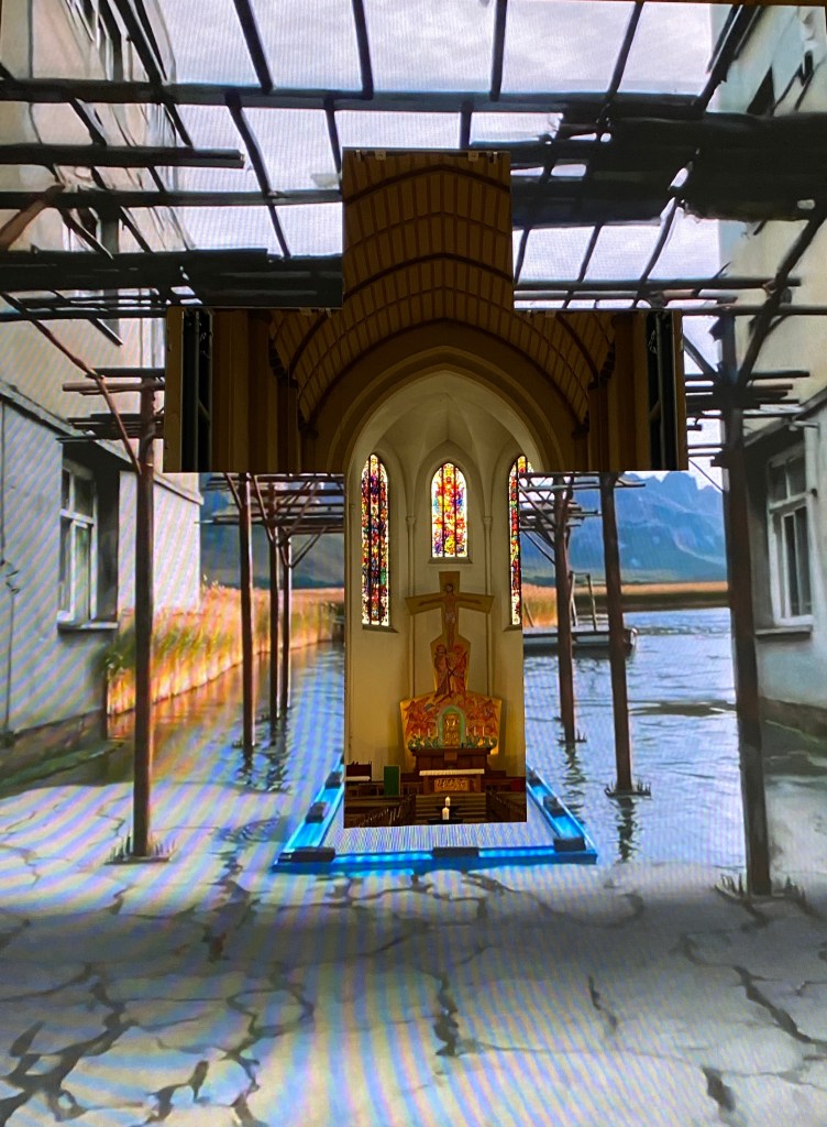 In den Seitengängen stehen freistehende LED-Skulpturen, kombiniert mit französischen Zierrahmen – ein deutlicher Verweis auf das private Wohnzimmer, platziert im öffentlichen, sakralen Raum. Auf den Bildschirmen laufen KI-generierte Sequenzen: fehlerhaft, unvollständig, manchmal schön, oft irritierend. Es ist keine göttliche Ordnung, sondern das Ergebnis algorithmischer Prozesse – maschinell erzeugt, aber nicht neutral.