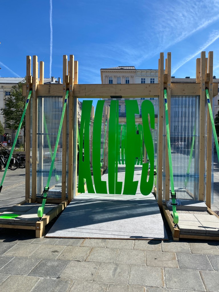 „Zwischen Holzrahmen und grünen Zeichen: Eine urbane Skulptur, die Sprache in Raum verwandelt – gesehen bei Ars Electronica 2025.“ Foto: Christa Linossi