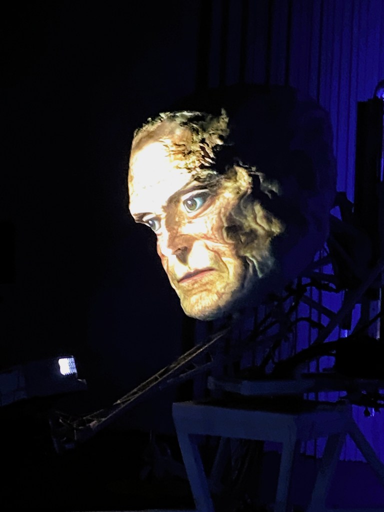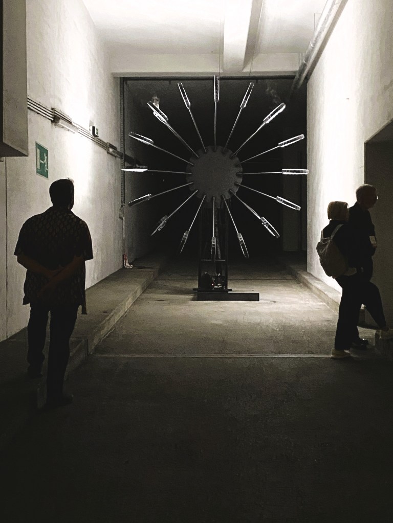 Mein Streifzug beginnt im BAU – einer ehemaligen Destillerie, die zum Labyrinth der Geschichte wird. Ein Schiff erinnert an Flucht und Rettung, ein ruinierter Banker liegt zwischen Spirituosen, während künstliche Intelligenz das System übernimmt. Und dann Gelitin: Ich steige allein in den düsteren Keller, werde von einer Lumpenfigur in ein Boot geladen und lande in einem Feuerkreis aus Lampen. Große Gipsköpfe starren sich gegenseitig an – und ich frage mich: War das einst ein Verlies?