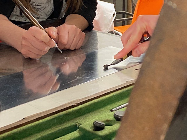Beim Tiefdruck liegen die druckenden Stellen vertieft in der Platte. Die Vertiefungen werden eingefärbt, die Oberfläche sorgfältig gereinigt, und unter hohem Druck entsteht der Abdruck. Die Teilnehmer:innen arbeiteten konzentriert an ihren Kupferplatten, ritzen Linien, suchten Motive, experimentierten. Ich selbst verließ den Raum bald wieder – Herr Möller hatte mich als Journalistin vorgestellt, und ich wollte die Gruppe nicht unnötig nervös machen.