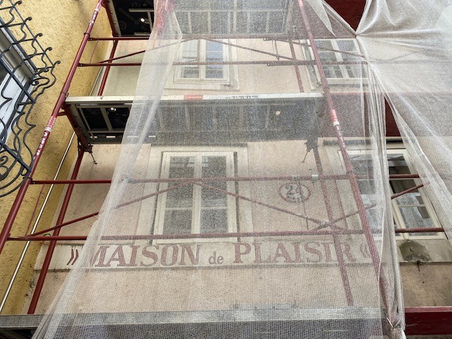 Fassade des „La Maison“ in der Steingasse – derzeit noch verhüllt. Foto: (c) Christa Linossi 2026