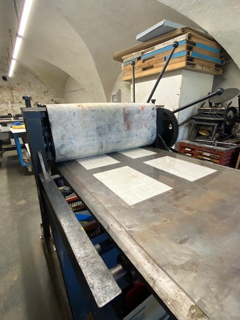 Große Tiefdruckpresse in einer Werkstatt mit Drucktisch, Walze und typischen Materialien der Druckgrafik.