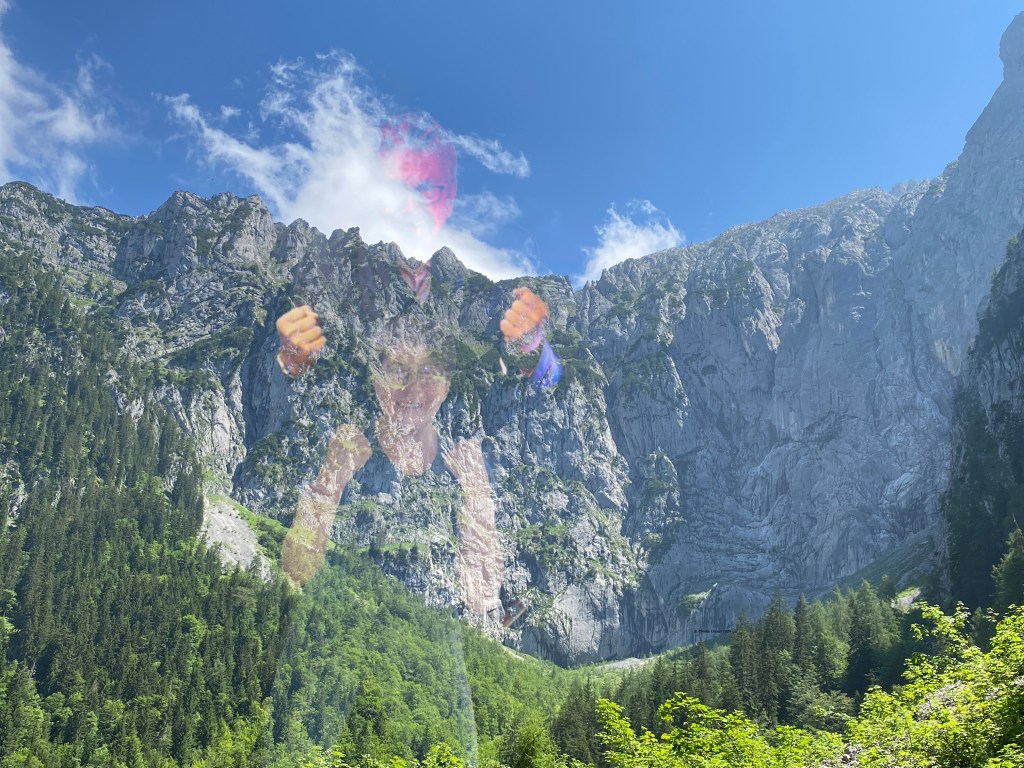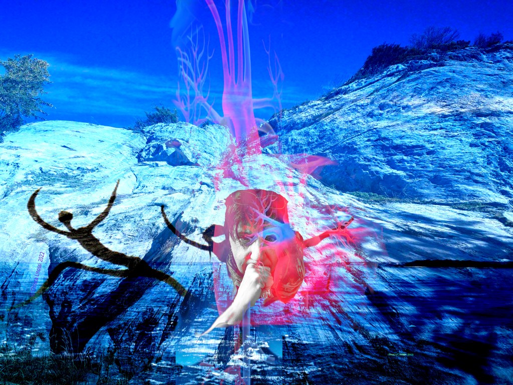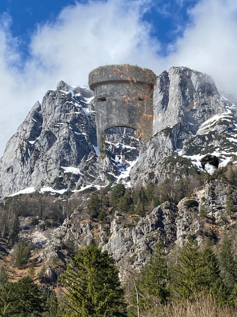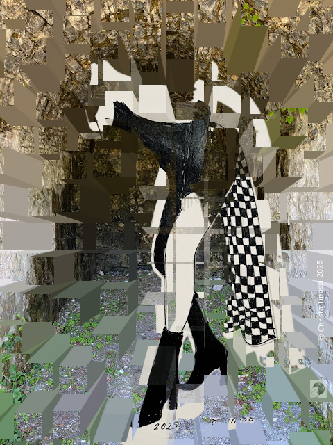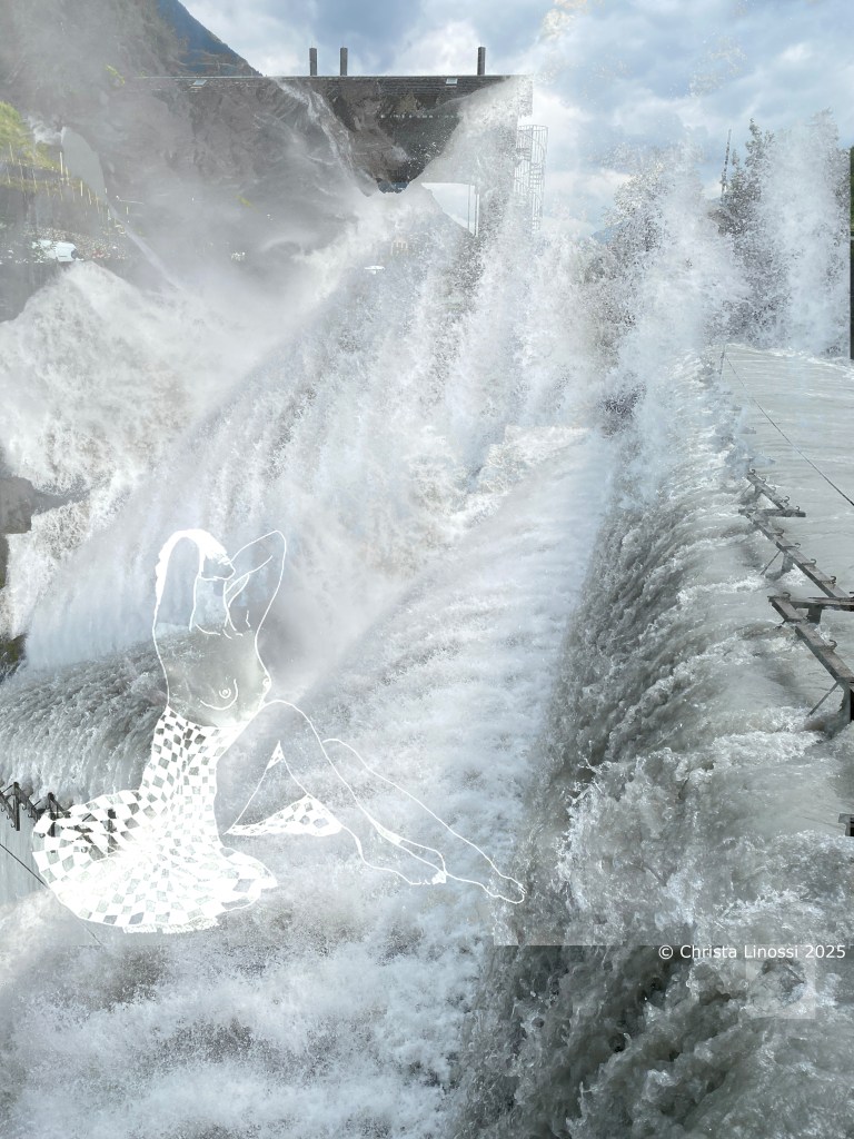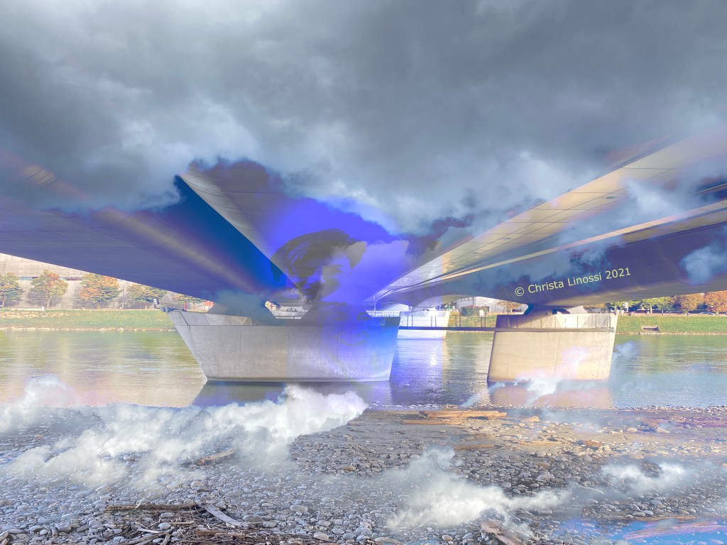 Am Fuß der Reiteralm, wo das Gestein schweigt und doch alles erzählt, liegt das Flussbett. Es ist kahl und trocken. Doch es ist voller Stimmen, die nicht verhallt sind. Wo einst Wasser tanzte, rauschte, lebte – bleiben nur die Steine sichtbar, groß und ruhend. Und es ist auch eine Spur von Mauer sichtbar, von Menschen gesetzt? Als wollte jemand sagen: „Bis hierher und nicht weiter“. Jetzt steht sie dort, die Frau, schwarz-weiß, gebrochen und stolz. Ein Mosaik aus Klarheit, ihr Rücken verbirgt eine Antwort? „Ich weiß, wie Wasser klingt. Ich weiß, wie Verlust sich anfühlt. Ich stehe, weil ich muss. Ich spreche, weil der Bach es nicht mehr kann. Beinhart. Weiblich.“