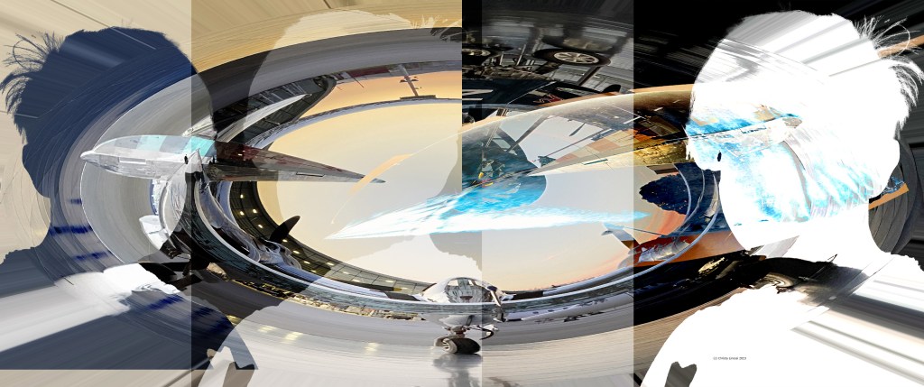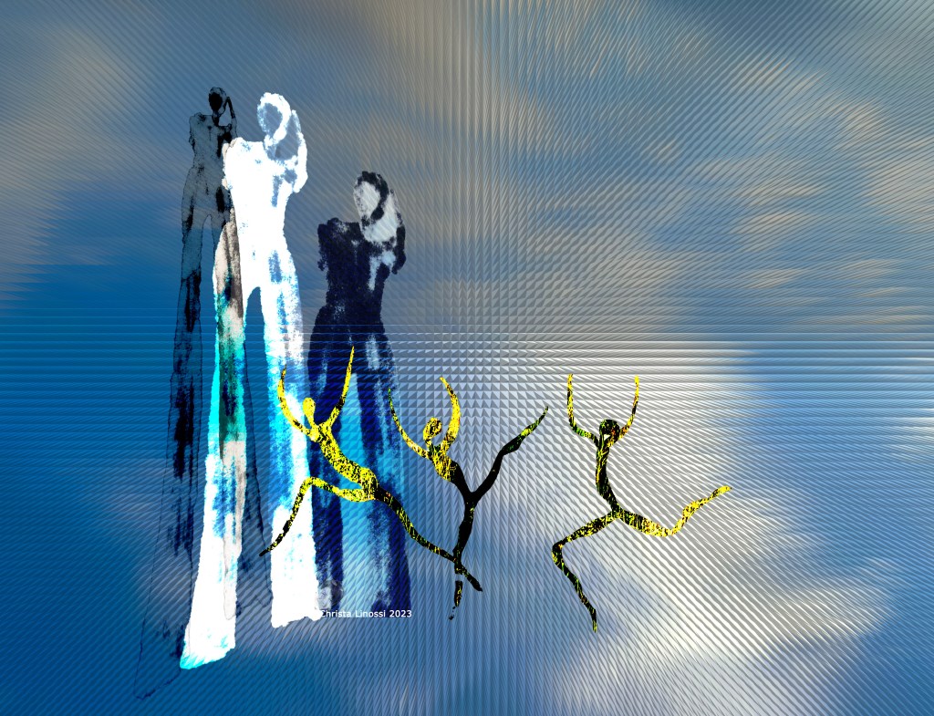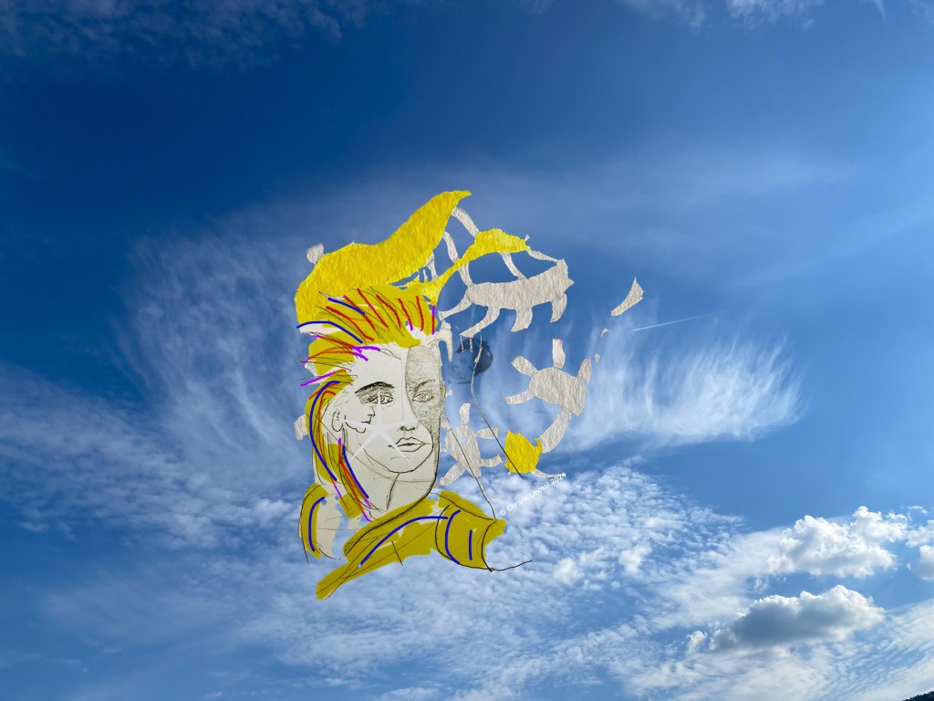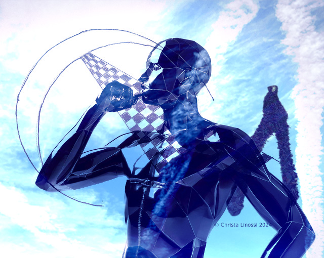 Die KI ist nicht mehr aufzuhalten, auch in der Kunst nicht. Heute startete ich meinen ersten Versuch, mit KI zu arbeiten. Meine Arbeit besteht aus einer Grafik mit einer Schattenfigur. Dazu kommt eine Fotografie des Himmels, die ich in Photoshop etwas verändert habe. Ich gab der KI mein Bild und wies sie an, einen Roboter hinzuzufügen. Dies ist nun das Endergebnis.