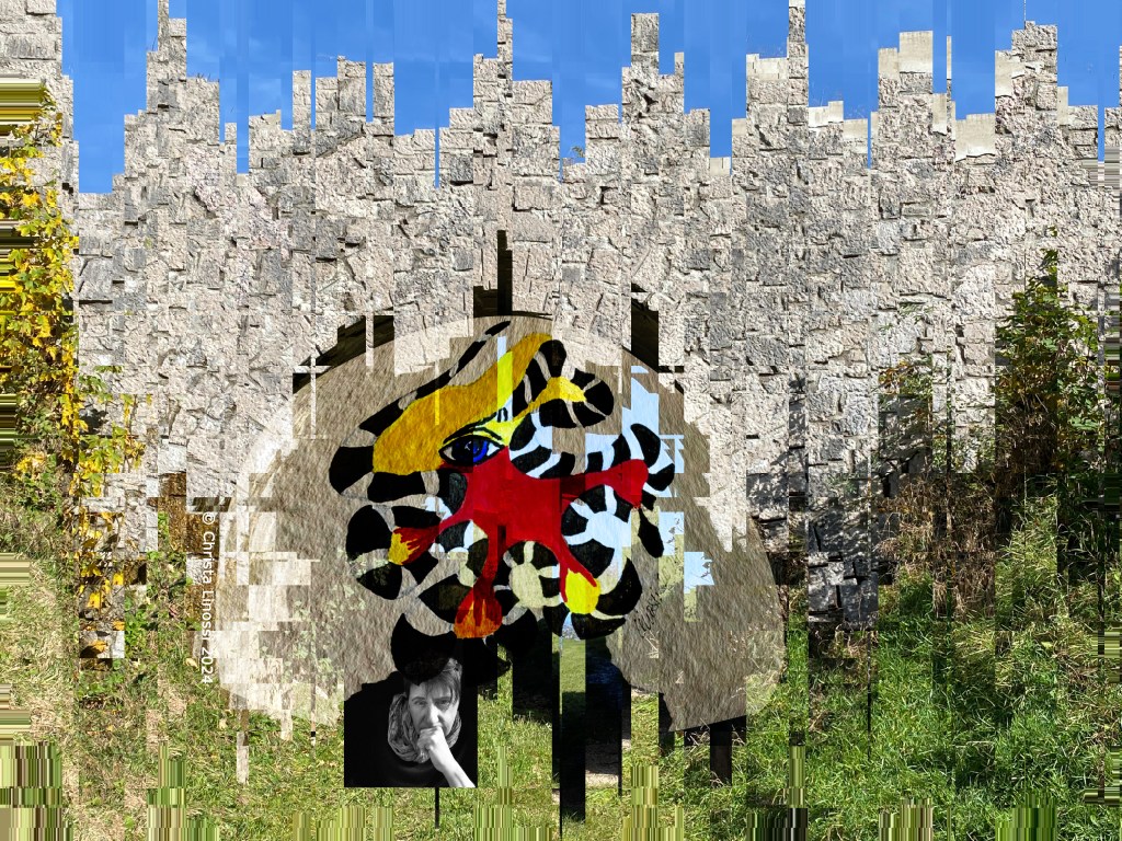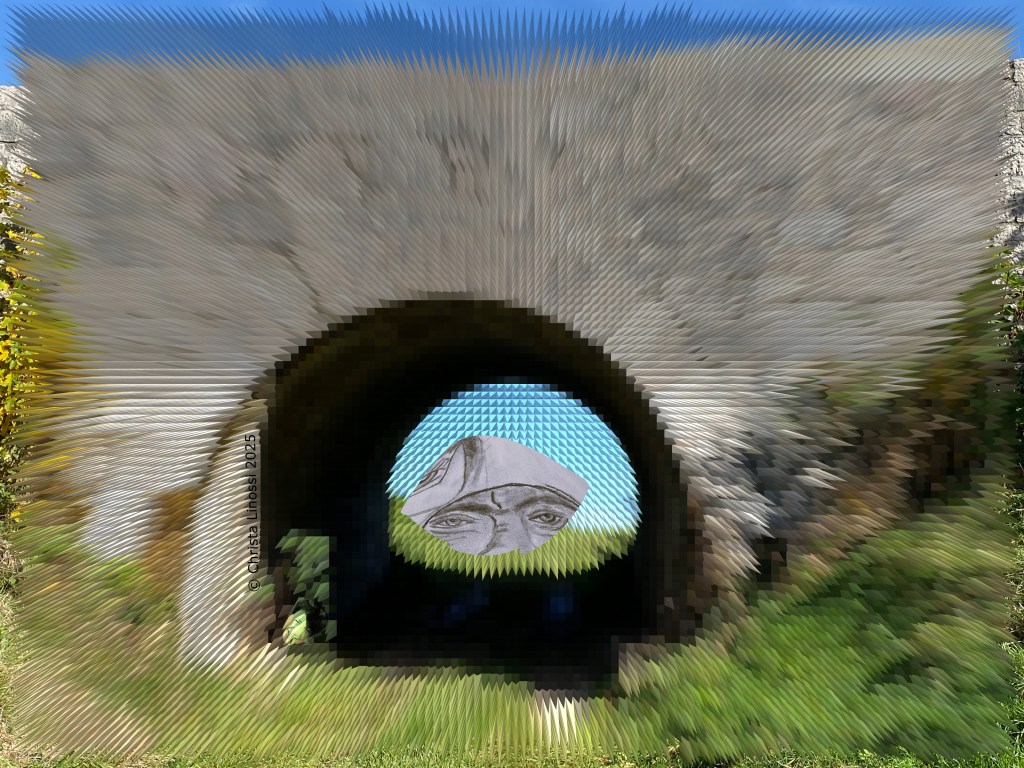 Meine neueste Arbeit ist ein Meisterwerk der experimentellen Fotografie und Grafik, das komplett ohne den Einsatz von KI entstanden ist. Das Bild zeigt eine geheimnisvolle Szene: Ein Mann, verborgen hinter einem Torbogen, fixiert mit intensivem Blick etwas jenseits des Betrachters.