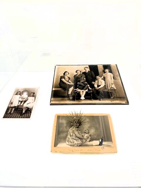 Ein altes Foto eines kleinen Mädchens mit Puppe, dessen Kopf von Nadeln durchstochen ist – verletzlich und präsent zugleich. Symbol für Druck? Für Schmerz? Für gesellschaftliche Erwartungen?