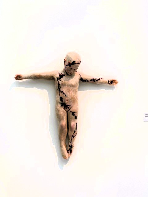 Auch Lucy Glendinning (*1964, Großbritannien) provoziert: Ein Baby, gekreuzigt an der Wand, umrankt von Weinreben. Aufschrei? Symbol für die Last des Lebens von Geburt an? Fragen, die offen bleiben.